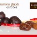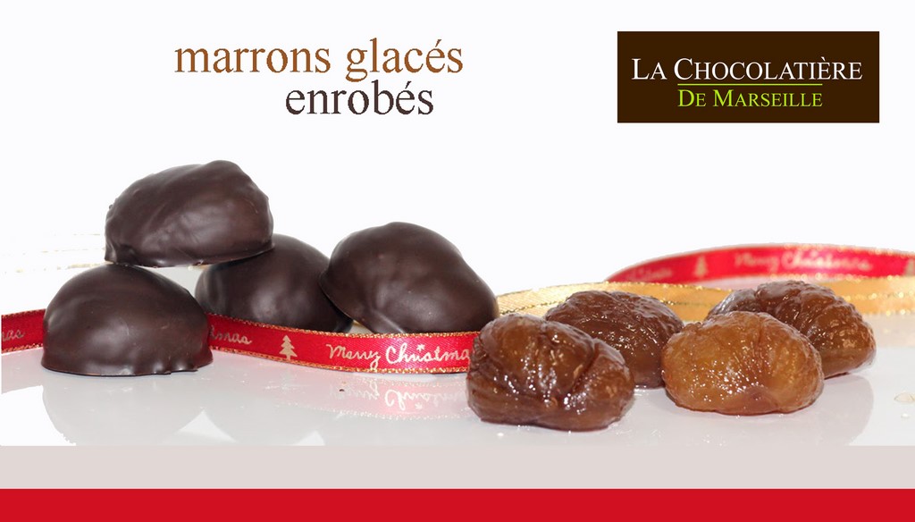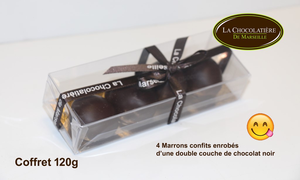 Coffret de 4 Marrons confits enrobés d'une double couche de chocolat noir à déguster.
