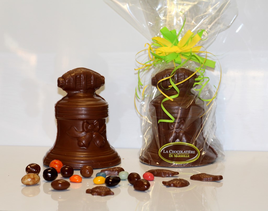 Cloche de Pâques en chocolat au lait, garnie de confiserie et de friture en chocolat (sans alcool).