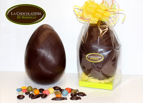 Oeuf de Pâques au chocolat noir, garni de confiserie et de friture en chocolat (sans alcool).